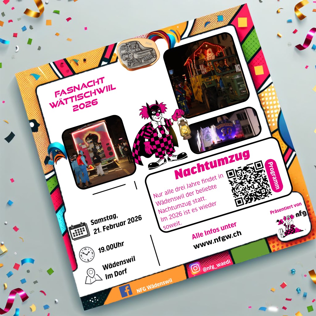 Nur alle drei Jahre findet in Wädenswil der beliebte Nachtumzug statt. Im 2026 ist es wieder soweit. Lass dich von den beleuchteten Sujets verzaubern und geniesse die nächtliche Fasnachtsatmosphäre.