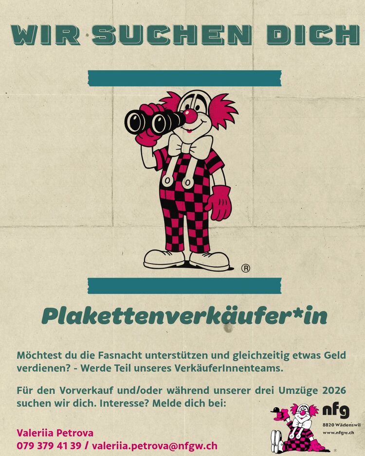 Wer der Wädenswiler Fasnacht einen guten Dienst erweisen und in einem aufgestellten Team Hand anlegen möchte, melde sich bei: